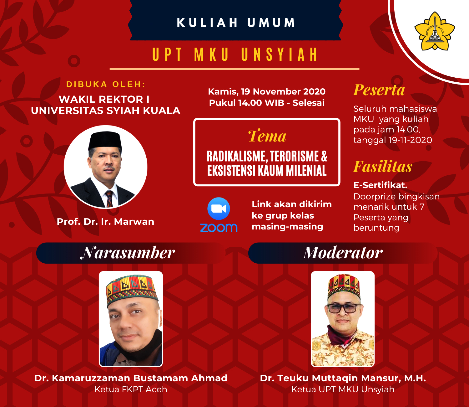 UNIVERSITAS Syiah Kuala melalui Unit Pelaksana Teknis Mata Kuliah Umum (UPT MKU) Universitas Syiah Kuala menggelar kuliah umum tentang radikalisme, terorisme dan eksistensi kaum milenial, Kamis (19/11). Kegiatan tersebut dibuka oleh Wakil Rektor Bidang Akademik Unsyiah, Prof. Dr. Ir Marwan dan dilaksanakan melalui daring. Kuliah umum tersebut menghadirkan Ketua Forum Koordinasi Pencegahan Terorisme (FKPT) Provinsi Aceh, Dr Kamaruzaman Bustamam Ahmad, MA sebagai pemateri tunggal.