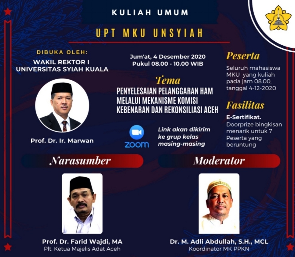 UNIVERSITAS Syiah Kuala melalui Unit Pelaksana Teknis Matakuliah Umum (UPT MKU) Unsyiah menyelenggarakan Kuliah Umum dengan tema: :Penyelesaian Pelanggaran Hak Asasi Manusia melalui Mekanisme Komisi Kebenaran dan Rekonsiliasi Aceh (KKRA)" pada Jum’at 04 Desember 2020. Kuliah umum ini dilaksanakan dengan menggunakan platform aplikasi zoom dan live streaming youtube diikuti oleh 500 peserta melalui zoom dan 2800-an mengikuti melalui live streaming youtube. Peserta yang mengikuti acara ini terdiri dari mahasiswa yang mengambil matakuliah umum pada UPT MKU Unsyiah, mahasiswa umum, akademisi dan praktisi baik dalam lingkungan Unsyiah maupun dari luar Unsyiah. Kuliah umum yang diselenggarakan  oleh UPT MKU ini dipandu oleh Dr. M. Adli Abdullah, S.H., M.CL, selaku Koordinator Matakuliah Umum pada UPT.